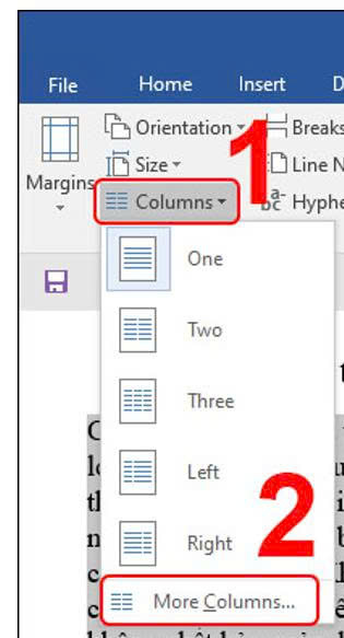 Đặt con trỏ soạn thảo tại phần văn bản muốn điều chỉnh > Chọn thẻ Layout > Chọn Columns > Chọn More Columns.