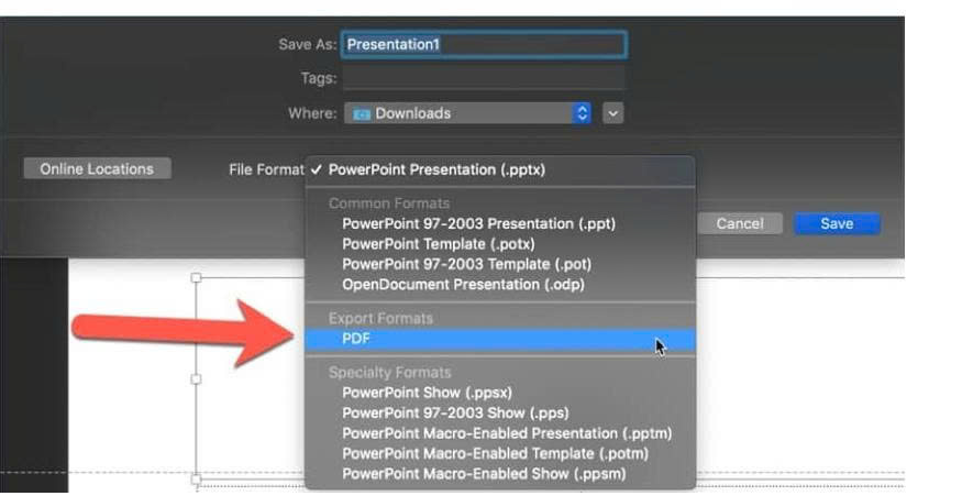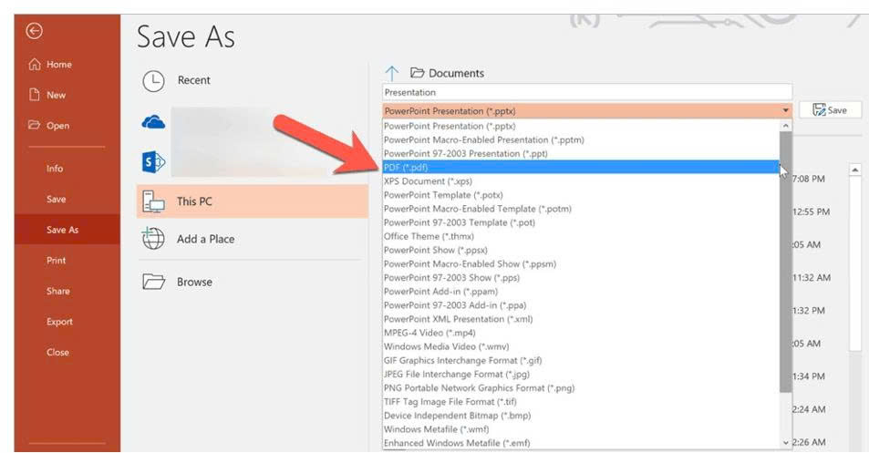 Với PPT trên Windows, truy cập menu File > Save As và chọn vị trí bạn muốn lưu tệp của mình. Như hình ảnh dưới đây cho thấy, PPT trên Windows cung cấp nhiều tùy chọn để chuyển đổi sang hơn so với trên Mac. Chọn PDF từ danh sách xổ xuống và đừng quên nhấn nút Save.