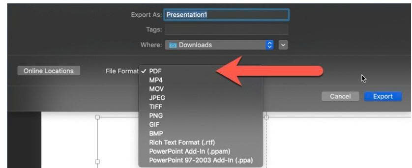 Hoặc bạn cũng có thể truy cập menu File > Export, từ menu xổ xuống tại mục File Format, chọn định dạng PDF, sau đó bấm nút Export để lưu bản trình chiếu dưới dạng PDF.