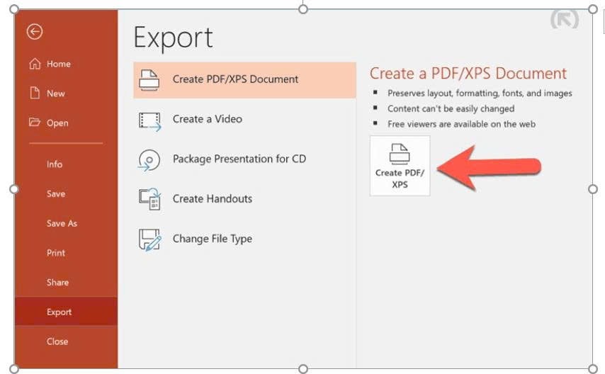 Đối với cách này, bạn truy cập menu File > Export > Create a PDF/XPS Document như hình bên dưới.