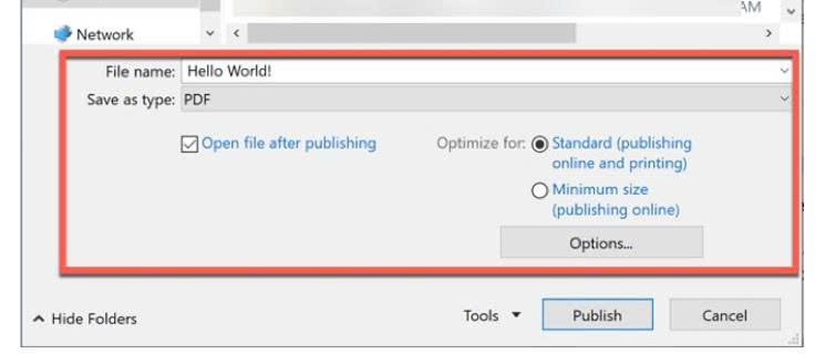 Trong hộp thoại mới hiển thị, bạn cần chỉ định vị trí muốn lưu tệp PDF, nhập tên cho file sau khi chuyển đổi tại khung File name và tùy chọn tối ưu hóa tệp PDF (Standard PDF – tốt nhất để in tệp) hoặc nếu muốn phiên bản PDF nhẹ để chia sẻ trực tuyến thì kích chọn Minimum size (publishing online).
